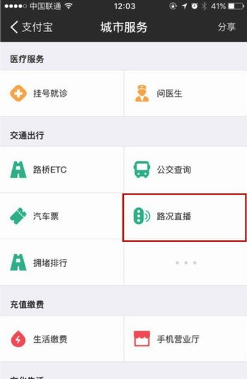 打开支付宝的城市服务,在城市服务中选择“路况直播”