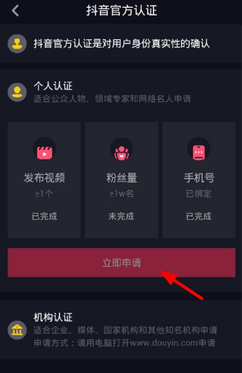 3、一般来说,用户需要满足发布视频大于1个、粉丝量大于1万人,绑定了手机号这三个条件,就可以去进行官方认证的申请了。