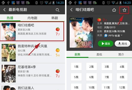 2)除了看精选的电视剧或电影外我们还可以收藏至收藏夹,下面小编以现在的热播剧咱们结婚吧为例,打开后点击右下角的星星标示可以收藏该电视剧,还可以离线下载电视剧。