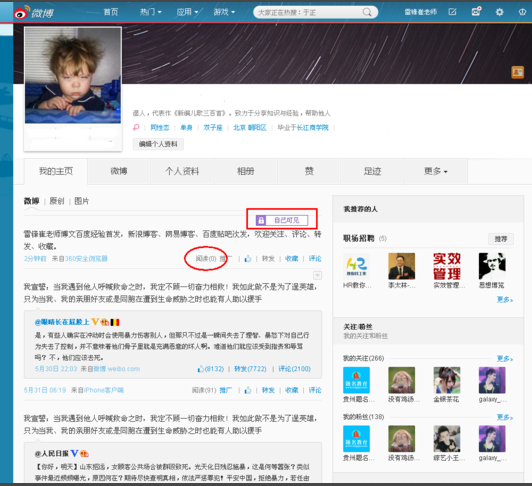 4、发布之后,我们会发现微博的右上角会有“自己可见”的标志,这就表示目前只能自己能够看到此条微博。