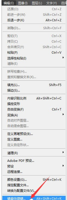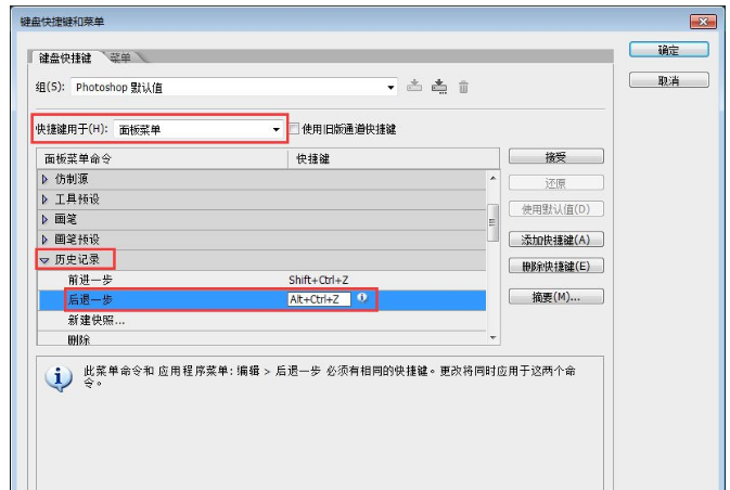 更改PS连续撤销快捷键的方法是:执行“编辑——键盘快捷键”——面板菜单——历史记录——后退一步,更改快捷键。