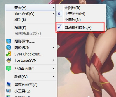 桌面右键--》查看--》选中【自动排列图标】。