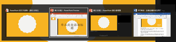 在主显示器上按下Alt+TAB进入窗口选择面板,可以看到除“演示者视图”、“放映视图”外,还有一个编辑视图在里面。也就是我们之前建立幻灯片的地方,直接切换到这个视图。
