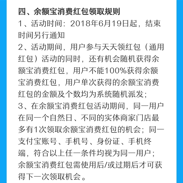 从2018年6月19日起,用户参与支付宝天天领红包活动的同时,还有机会获得余额宝消费红包。