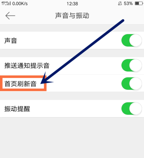 在声音与振动功能中,点击关闭“首页刷新音”开关即可取消首页刷新时的提示音,如图所示,