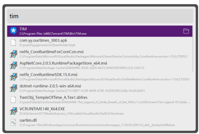 除了做到本地/网络双搜索外,火萤酱还支持快捷打开本地软件。例如在搜索框中输入TIM ,回车即可打开TIM 。同时它还支持缩写(例如PS )、甚至是俗称(例如吃鸡)打开应用,可以说是相当人性化了。