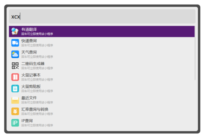 打开小程序的方式也十分简单,只需要在火萤酱的搜索框中输入 “ XCX ”即可打开。火萤酱提供了快递查询、记事本……在内的十余个小程序,基本可以满足大部分使用场景,同时火萤酱表示小程序的数量还在不断更新中,不得不说开发者已经十分用心了。