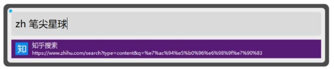 此外,火萤酱的网络搜索功能还提供快捷搜索短语。比方说你需要在知乎中搜索“ 笔尖星球 ”,你只需在火萤酱的搜索框中输入“ zh笔尖星球 ”,回车即可打开网页。同样,如果想要百度则可以输入“ bd笔尖星球 ”。