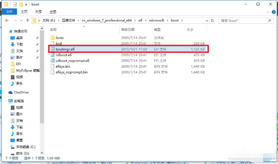 3 、随后在你的Win7安装包中根据:efi→microsoft→boot如下图所示。文件夹中无bootmgr.efi文件。