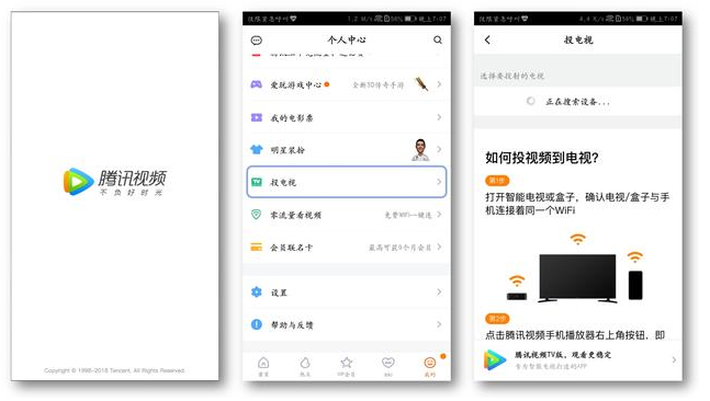 2) 打开手机上的“腾讯视频”应用,进入“我的”菜单,选择“投电视”功能。