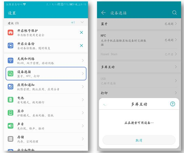3)打开手机设置菜单,选择“设备连接”项目,将“多屏互动”开关开启,手机即开始搜索显示设备,点击搜索到的设备名称即可进行Miracast连接。