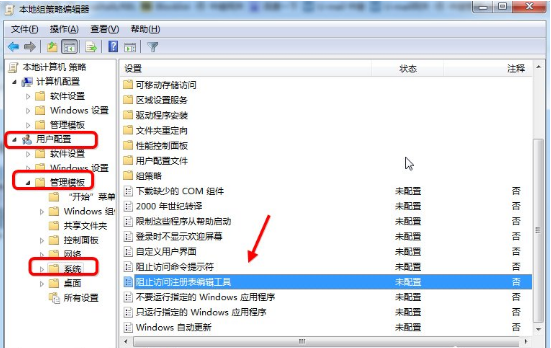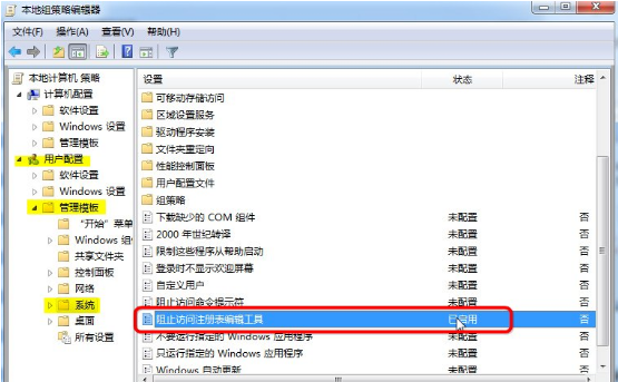 2、打开本地组策略编辑器,依次找到如图 计算机配置---用户配置---管理模板---系统--- 组织访问注册表编辑工具。