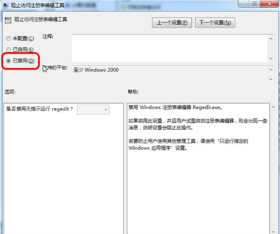 点击阻止访问注册表编辑器工具,设置为禁用或者未配置,然后保存。
