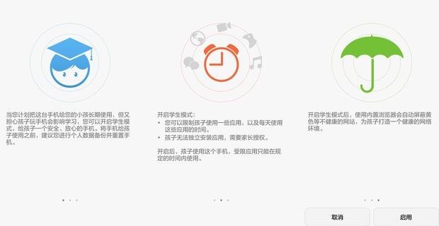 “当您计划把这台手机给您的小孩长期实用,但又担心孩子玩手机会影响学习,您可以开启学生模式,给孩子一个安全、放心的手机。”