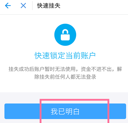 此时会弹出快速挂失页面,我们点击【立即挂失】,会弹出挂失后的账户处于什么状态的提示页面,然后点击【我已明白】,