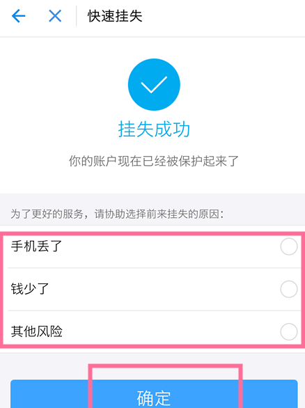 然后会提示你已挂失成功,但还需要勾选挂失的原因。勾选好挂失的原因,点击下方的【确定】按钮,这样就完成了帐号挂失,挂失帐号中的资金是无法使用的。