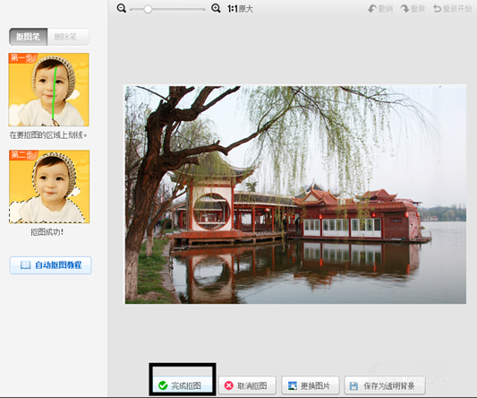 此时会弹出自动抠图的编辑页面,因为我们需要照片的全景,所以此时进行任何处理,只需点击“完成抠图”按钮即可。