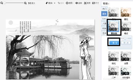 完成以上步骤后,此时页面会返回到图片美化的编辑页面,我们点击右边特效区里的“基础”特效,选择“黑白色”特效,特效度100。