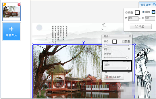 此时会返回背景添加的编辑页面,然后我们把风景照片拖拽到合适的位置,点击风景照片上的定点改变照片的尺寸,这样子风景照就会覆盖背景。