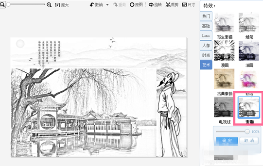 然后我们再点击特效菜单栏里的“艺术”特效,在弹出的艺术特效选择菜单栏里选择“素描”特效,特效度100。
