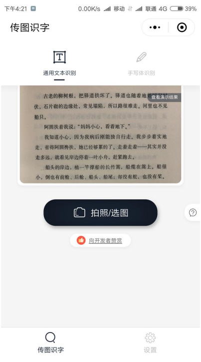 微信小程序现在越发流行了,下面给大家分享一个我最近在用的小程序——传图识字。这个小程序可以任意选一张带文字的照片,然后它会抓取文字,你就可以复制这些文字了,方便快捷。