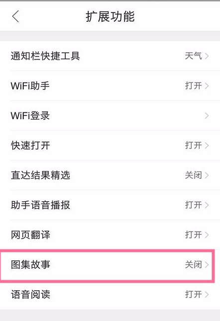 此时会弹出扩展功能页面,在扩展功能页面里点击【图集故事】,此时会弹出图集故事开关按钮,将此按钮点亮。