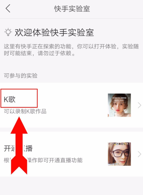 在快手实验室里进入K歌功能选项,