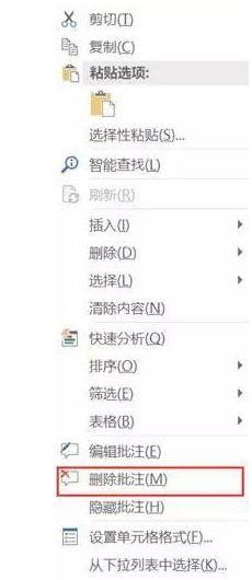 第一种:选中有批注的单元格,之后右击选择删除批注。