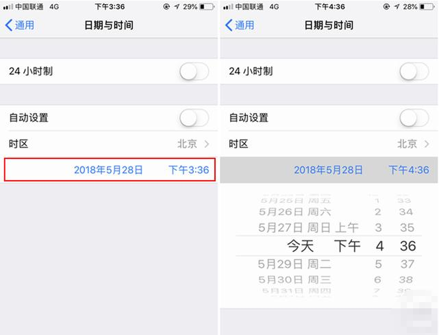 这个时候,你会看到「自动设置」一栏是打开的。将它关闭,点击最下面一栏,开始选择比今天更晚的任何时间。