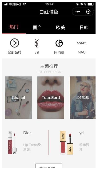 这是一款女生必备的小程序,试色非常全,YSL、阿玛尼、露华浓......从平价彩妆到热门色号全都有。