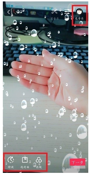 5、拍完后点击【选音乐】,配上喜欢的音乐,左下角选好特效、滤镜和封面。