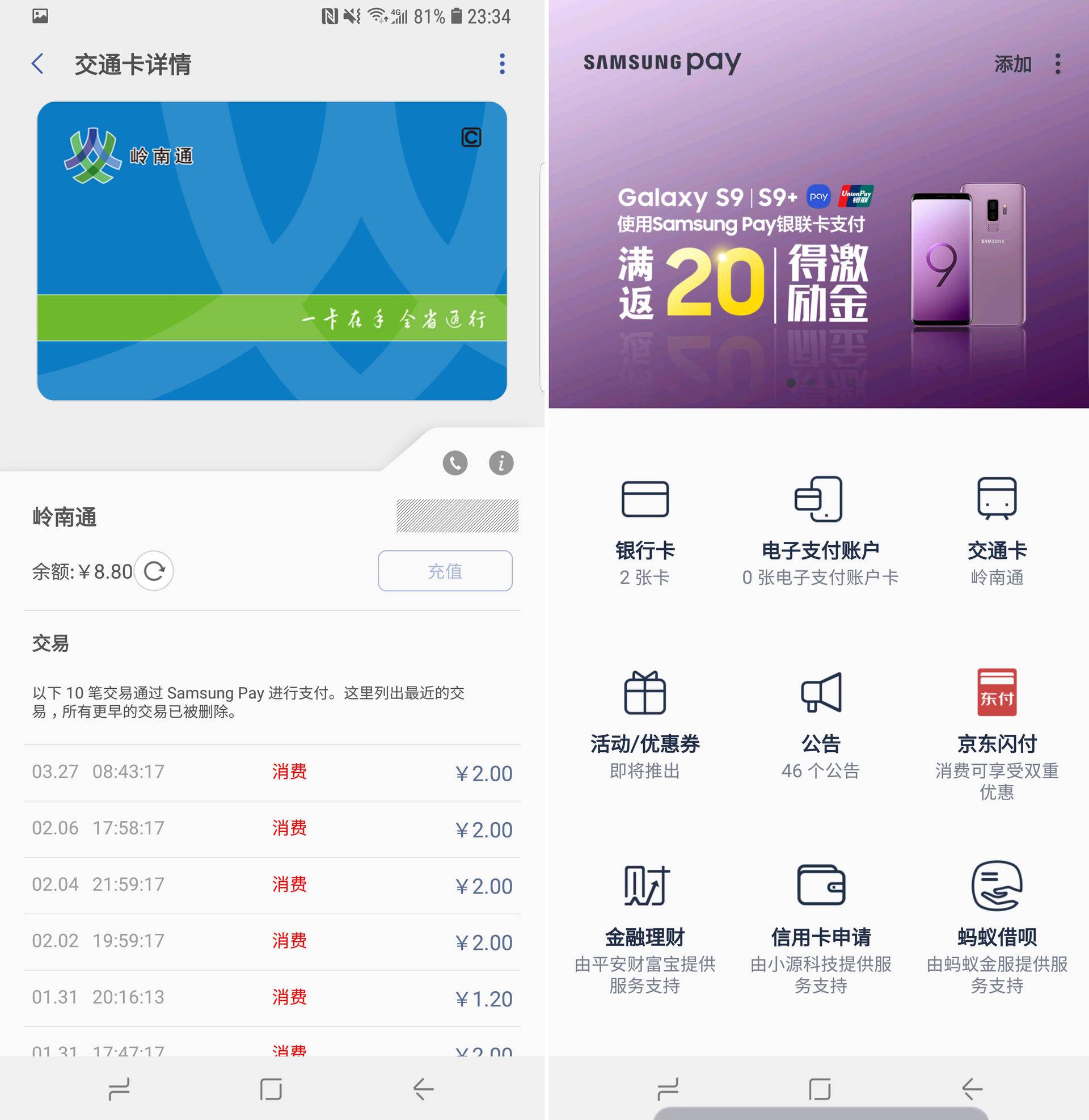 在 2017 年年底,Samsung Pay 就已经正式支持岭南通应用。它和小米的开卡方式类似,是需要另外在手机中单买的,余额也是直接通过银行卡充值;但好处在于,使用 Samsung Pay 过闸时只要贴一下手机背部就好了,你甚至都不用解锁屏幕,非常方便。
