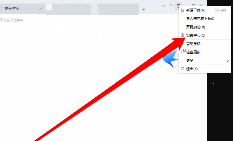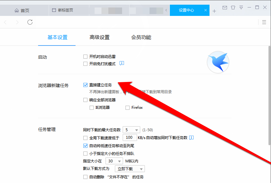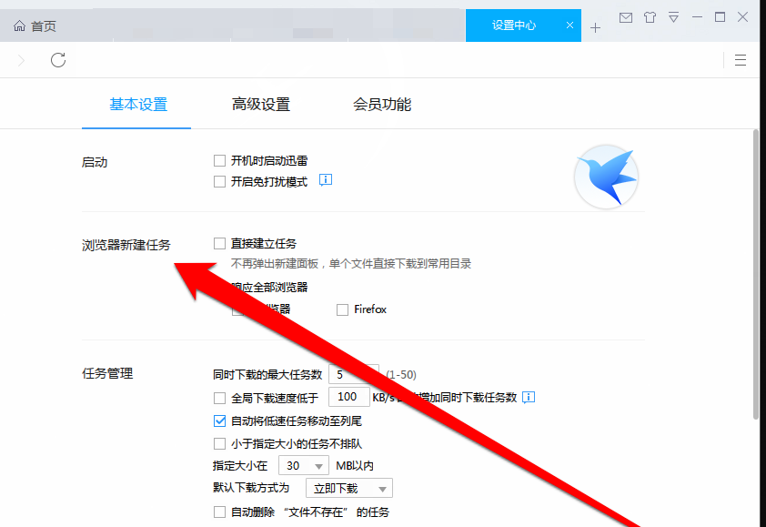 点击设置中心按钮后,进入设置中心界面,在界面勾选浏览器的新建任务。