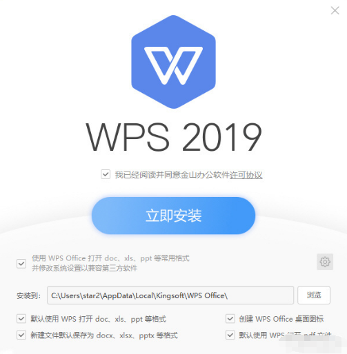 WPS Office 2019的安装依然采用一键安装模式,在安装选项中则多了一个“默认使用wps打开pdf文件的选项”,看来新版对PDF文档的支持应该有所增强。安装包大小为96.6 MB,依然小巧玲珑,依然对个人用户实施免费策略。此外,这次还发布了MAC版本,至此,WPS实现了目前流行平台的全覆盖。
