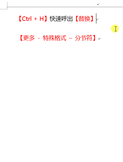 方法:【Ctrl + H替换】,光标定位到【查找内容】,左下角点击【更多】,底部点击【特殊格式 - 分节符】——点击【全部替换】。