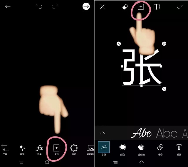 三、然后在纯黑色背景素材中,点击添加文本,然后输入你的姓氏,比如你姓“张”,字体颜色为白色,然后将字放置正中,再点击“+”号放大子图,如图所示。