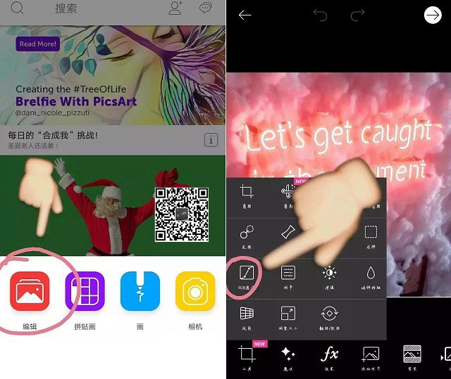 五、使用 picsArt 软件打开一张你喜欢的手机壁纸背景图片,然后点击下方的“添加图片”,然后再将刚才制作好的“姓氏文字图片”加入进来,再点击混合,之后可以进行“加亮”,调整位置等操作,直到自己满意为止。