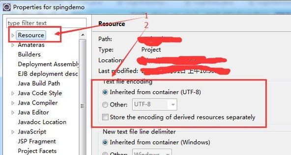 在Eclipse项目文件上右键,选择Properties,点击Resource选择修改编码格式,如下图: