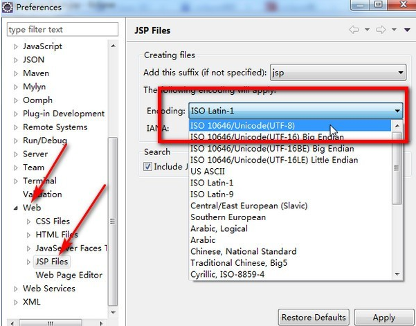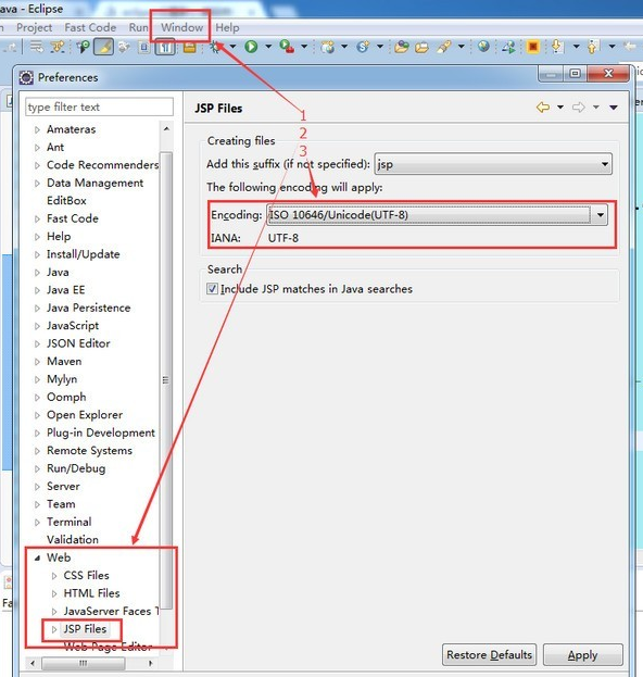 Window->Preference->web->JSP Files,如下图: