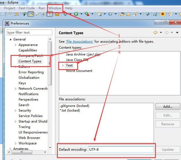 在Window--》Preferences--》General --》Content Type--》Text的最下面设置为编码格式为UTF-8,如下图: