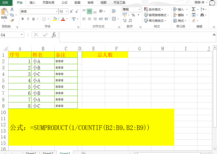 统计不重复人数公式:=SUMPRODUCT(1/COUNTIF(B2:B9,B2:B9))