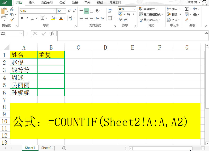 统计两个Excel表格重复内容的公式:=COUNTIF(Sheet2!A:A,A2)