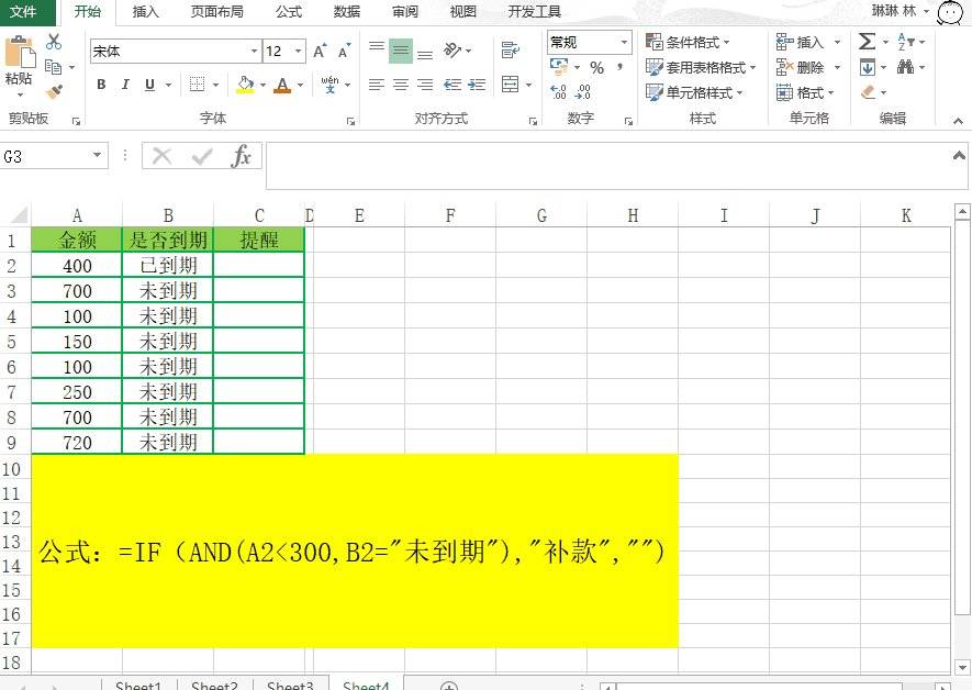 同时判断多列数据是否满足条件公式:=IF(AND(A2<300,B2=\"未到期\"),\"补款\",\"\")