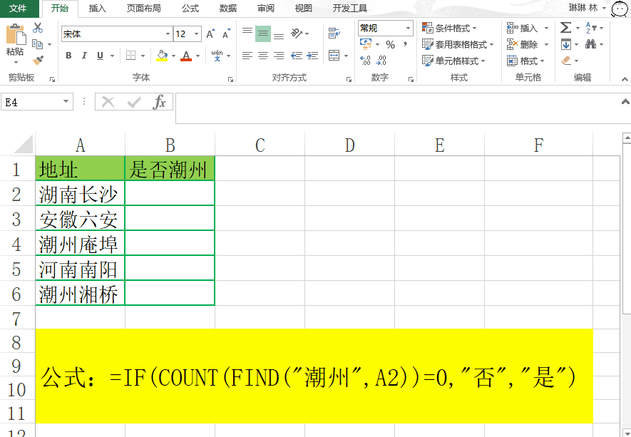 字符串查找公式:=IF(COUNT(FIND(\"潮州\",A2))=0,\"否\",\"是\")