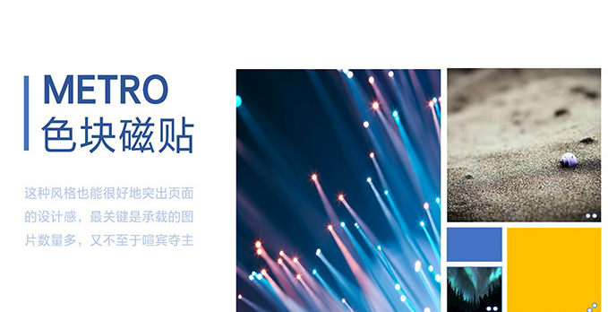 除了层叠式排版,另一种色块变形就是类似METRO的磁贴风格。这种做法也很简单,直接使用SmartArt里的对应模板即可,和层叠式设计一样,METRO做出的页面同样质感很强,且图片承载量更大。在这种设计中,图片依旧是作为陪衬使用,不会有喧宾夺主之嫌。