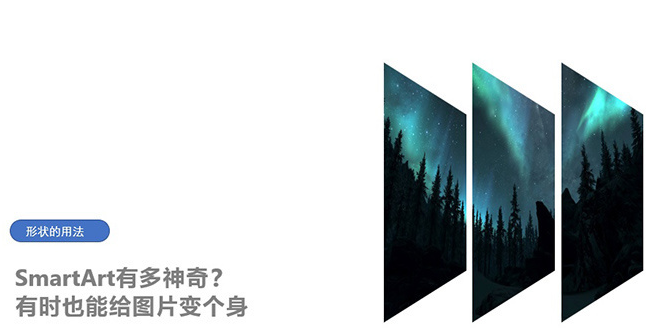 以上图为例,先用自定义图形做出三个平行四边形,然后右击将它们组合起来。接下来点击选择“设置图片格式”,将填充里的“无填充”改为“图片或纹理填充”,最后挑选一个合适的图片即可。当然你也可以通过SmartArt实现这一效果,唯一区别就是在导入图片前,先要右击将其“转换为形状”,其他原理和自定义图形一样。