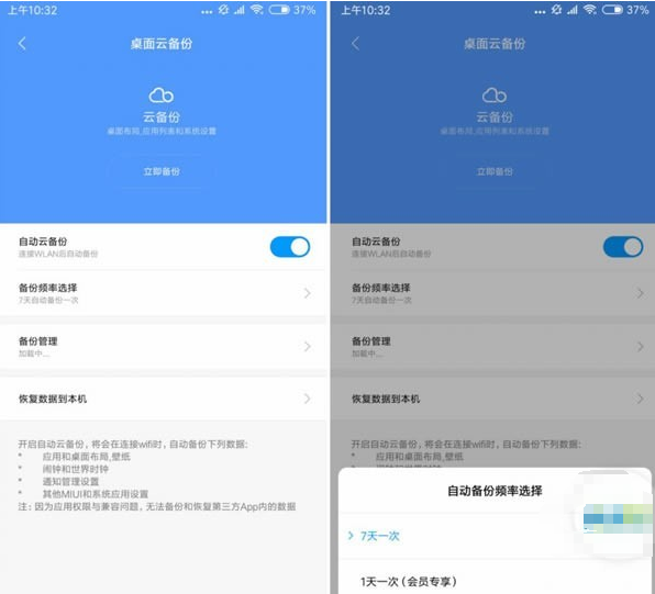 同时,MIUI也提供了云备份服务,登录ID后,系统会自动备份桌面数据、联系人、短信、相册、通话记录、信息助手、浏览器数据、便签等内容。备份周期有7天一次和1天一次可选,但后者需要会员充值后才能使用。