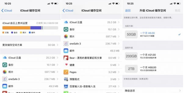 在「升级方案」里,苹果提供了5/50/200GB、2TB四种方案可选,费用从6元到68元不等。