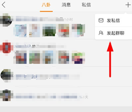 2、接下来在八卦页面的右上角点击“+”选项,就可以点击“发起群聊”功能,添加好友创建群聊了。