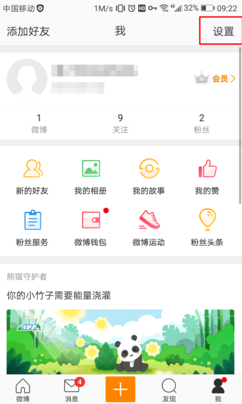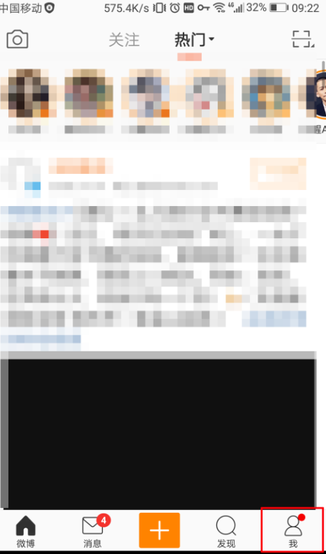 打开新浪微博,进入页面,点击下方的“我”。